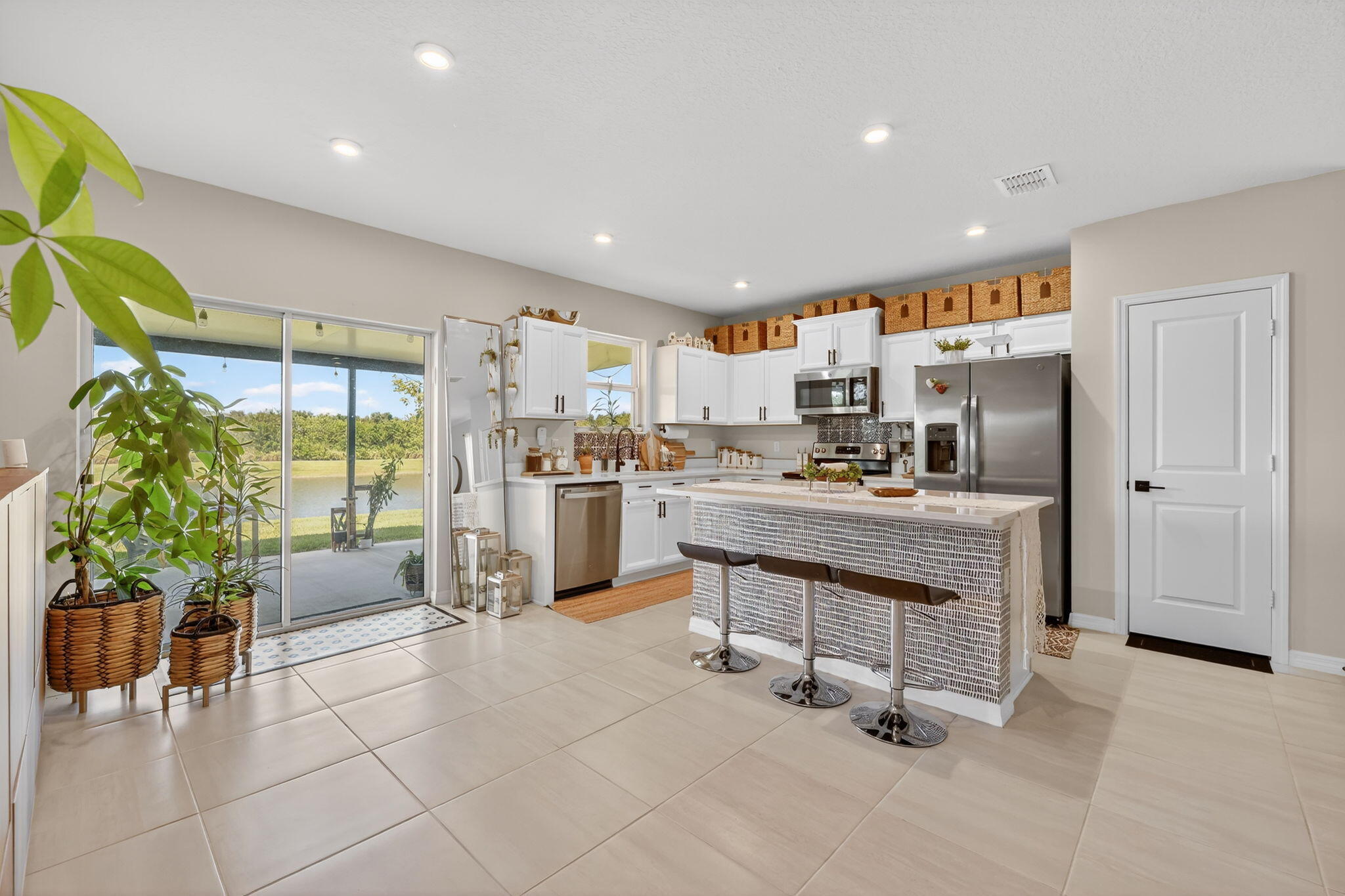 This charming 3 bedroom, 2 bath home with a 2 car garage attached parking, offers modern living in a convenient location. This spacious and bright open floor plan features tile flooring through out house. The kitchen includes a large island with an eat at bar, stainless steel appliances and a pantry. The open floor plan allows to interact from kitchen and living room. The backyard includes a covered patio with a lake view. This rental is available furnished and unfurnished and the furniture included is negotiable, personal decorations not included. Washer and dryer vacant as well upon request.