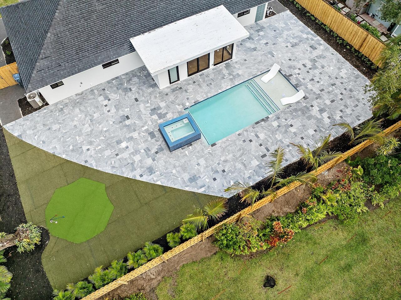 WALK TO THE BEACH! No expense spared in reinventing this exquisite true 3 bedroom home w/den. Major improvements completed in 2026 include new roof, impact glass doors/sliders, full electrical rewire w/new panel, new plumbing and sewer lines, spray foam insulation, new ductwork, and new A/C unit and handler. The stunning brand new pool with raised spa features a sundeck, pool heater, and saltwater system, creating a private resort style oasis. The chef's kitchen showcases ALL AMERICAN custom wood cabinetry, Taj Mahal quartzite countertops, full backsplash, and a grand waterfall island. Designer finishes abound throughout, including beach oak porcelain tile flooring, crown molding, upgraded baseboards, solid wood core doors, LED recessed lighting, and statement light fixtures and fans The baths have been tastefully redesigned with new tile, vanities, and glass enclosed shower/tub combinations. Additional highlights include an oversized laundry room with sink and upper and lower cabinetry, and a versatile denideal as a home office or gaming roomenclosed with a stylish barn door. The outdoor space impresses with a new fence, fresh landscaping, nearly 3,000 square feet of French pattern marble decking, a putting green, and an outdoor shower. Modern conveniences include EV charging, epoxy garage floor, impact garage door, Ring doorbell, smart appliances, and a custom living room wall with electric fireplace. The primary suite is a true retreat, featuring a massive 8x14 custom closet and a spa inspired 6x6 shower with bench, niche, six jets, double door entry, rain head, standard head, and handheld feature. Natural light pours in from the moment you step off the brand new driveway through the custom front door into the open, entertainer friendly main living area.