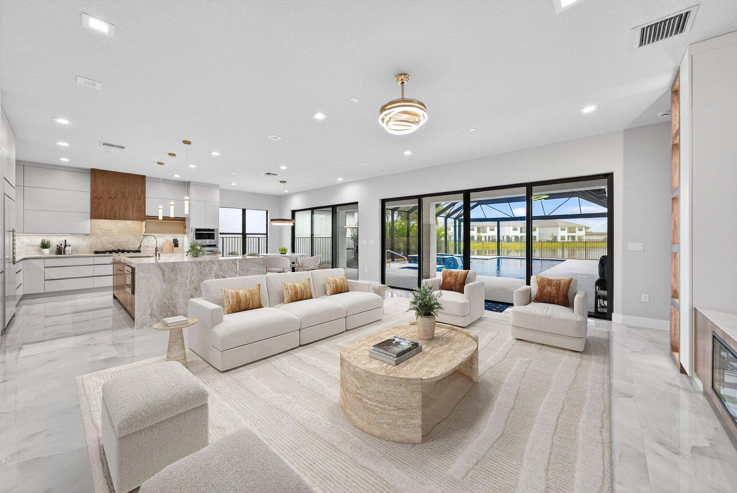 BRAND NEW Luxury residence in Apex at Avenir. This striking modern two story 5 bedroom, 5.5 bath home offers over 5,136 square feet of impeccably designed living space, perfectly positioned on a premium lakefront homesite with beautiful water views. Exceptional upgrades and top of the line finishes are showcased throughout, creating a truly elevated living experience. Upon arrival, an expansive foyer sets the tone with custom LED light fixtures, a sleek designer staircase with custom railing, and elegant panel molding extending to the second floor. Be impressed by flawless Level 5 finished walls complemented by custom paint throughout The chef's kitchen is a showpiece, offering custom floor to ceiling Kabco wood cabinetry with Designers trendy Walnut combo modern Gola design pairing effortlessly with a dramatic Quartzite Taj Mahal waterfall island, offering ample storage and inviting snack bar seating. A seamless quartzite backsplash with concealed outlets, maintains clean architectural lines, while gold hardware adds a touch of warmth. Professional grade Sub Zero and Wolf appliances including, steam and convection ovens, a 5 burner gas cooktop, and a statement hood. Two pantry options include a dedicated kitchen pantry and a spacious walk in pantry tucked beneath the staircase. The kitchen opens effortlessly to the dining area and family room, ideal for entertaining. The family room features a custom built in with display cabinetry, remote access Linear LED electric heated fireplace and a dry bar with beverage refrigerator, blending style and function. The primary suite conveniently located on the first floor impresses with custom lighting, dual walk in custom closets, and a spa inspired bath with dual vanities, soaking tub, separate private water closets with ADA accessible sink and ADA accessible glass walk in shower showcasing three shower heads and built in seating. The home features European engineered white oak flooring and 2 x 4 porcelain tile throughout. A custom, private ADA accessible elevator leads to the 4 upstairs bedrooms, media room and loft. A wall of glass spans the rear of the home, unveiling the grand outdoor living space. Enjoy a screened in patio and an oversized gas heated salt water pool and spa with sun shelf framed by marble stone pavers. Built in planters include water bibs and power sources for convenience, and the home is pre plumbed for a future summer kitchen. Additional highlights include two laundry rooms (one on each floor) with large capacity Electrolux appliances, a second floor wet bar in the loft space, impact glass throughout, and a 3 car garage with epoxy flooring, workspace, and storage. Get excited for the exclusive Apex at Avenir brand new clubhouse featuring lush landscaping, picturesque walking trails, pickleball and tennis courts, state of the art fitness center, elegant lobby and lounge with bar and expansive sun deck with shaded cabanas surrounding the lap pool and whirlpool spa. Additionally, a new Town Center, now under development offering shopping and dining options. Enjoy peace of mind with a 24 hr manned gate at Apex. This exceptional home is a rare offering where modern design, premium finishes, and thoughtful craftsmanship come together to create a truly elevated lifestyle in Avenir.