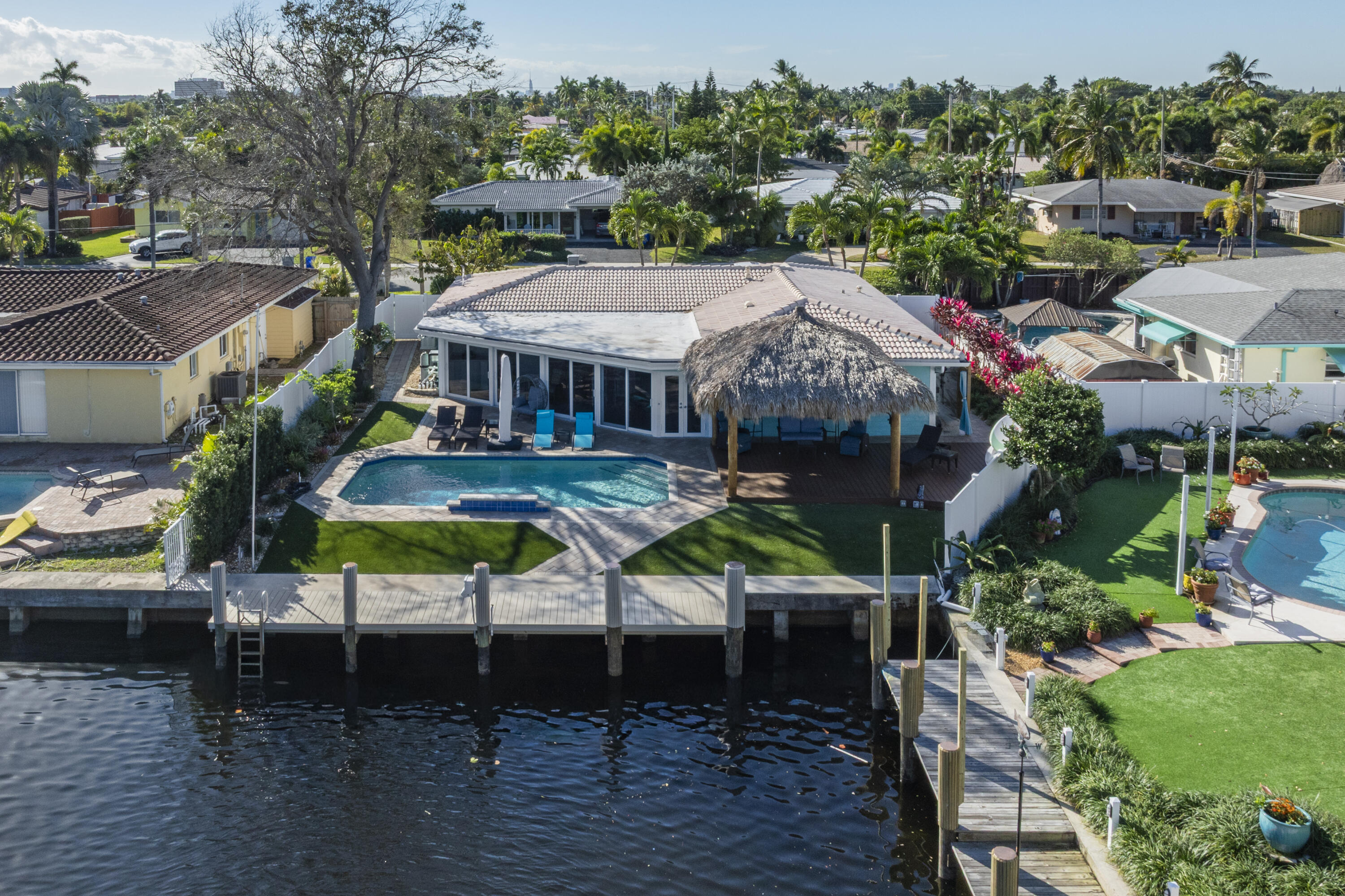 Private waterfront oasis! This impeccably renovated resort style home offers the ultimate indoor/outdoor lifestyle with stunning water views and new high end finishes throughout. Elegant new kitchen, designer flooring, and spa inspired baths with soaking tub and walk in shower. Enjoy a saltwater pool, outdoor shower, Tiki hut, and new dock (bridge renovation nearby). Upgrades include impact windows, full water purification system, central vacuum, motorized shades, custom cabinetry, landscape lighting, new A/C with Blue Light protection, and gas stove, dryer, pool heater & generator. Room to add a 3rd bedroom. Rare opportunity to own a piece of paradise in the emergenging up and coming luxuries of Pompano Beach. Schedule your private tour today!