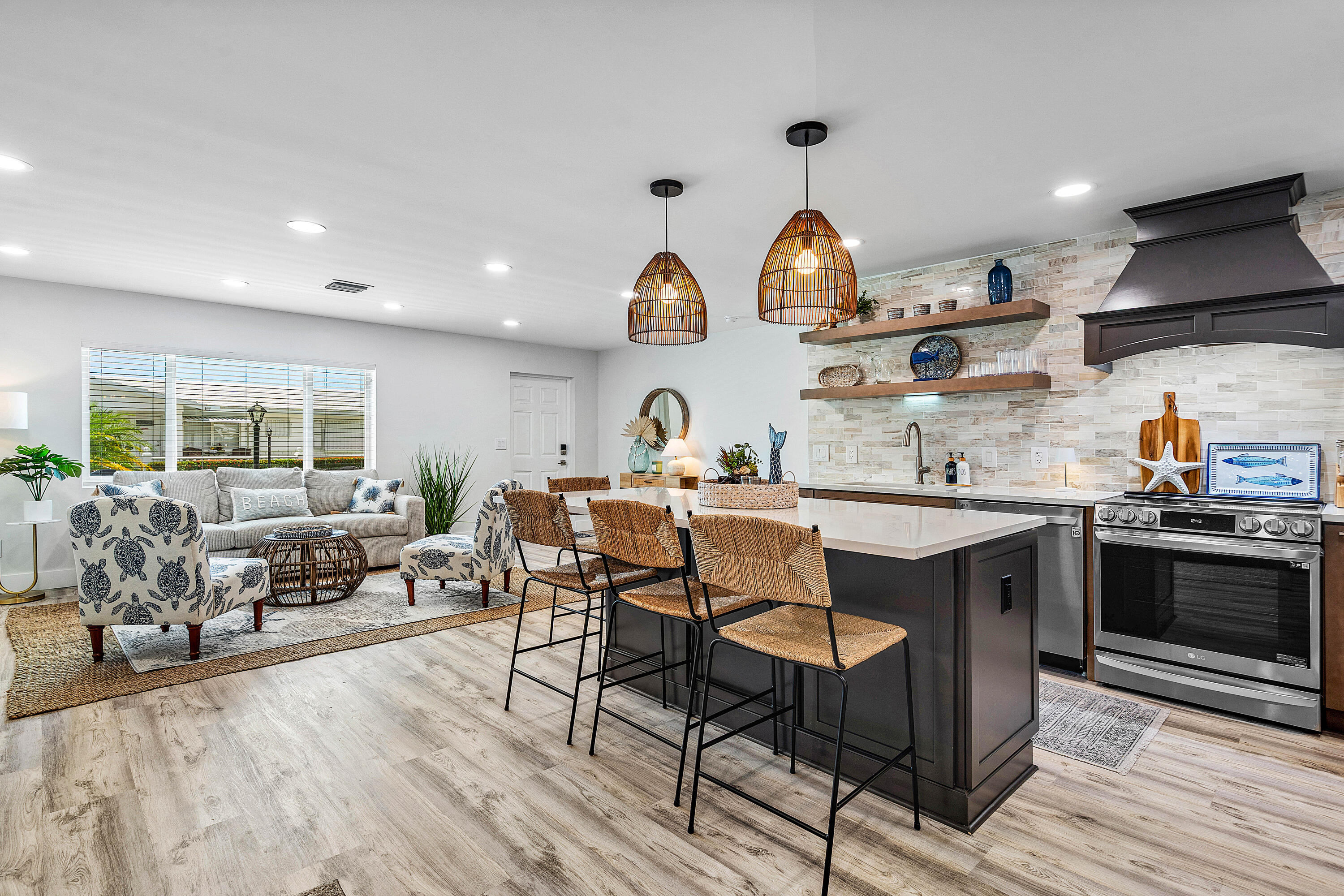 Totally and professionally refurbished. Move in ready. 3 bedrooms and 2.5 baths. Many high end materials used. High quality flooring, cabinets and appliances. New A/C with halo air purification system, tankless water heater, new HVAC ducting, new lighting and electrical panel. Impact windows and doors This has to be seen to be appreciated. A third bedroom and 1/2 bath were added, and totally redesigned floor plan makes this a true open concept home.